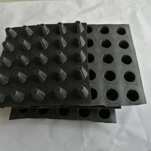 Plastic HDPE dimple drainage board sheet is the use of foundation or blow molding method to produce high density polyethylene (HDPE) geomembrane, pressed on geomembrane pressure after the special craft the closed swelled the frustum of a cone shape, having a three-dimensional space and some support stiffness, liquid, gas can flow excreted within its plate.